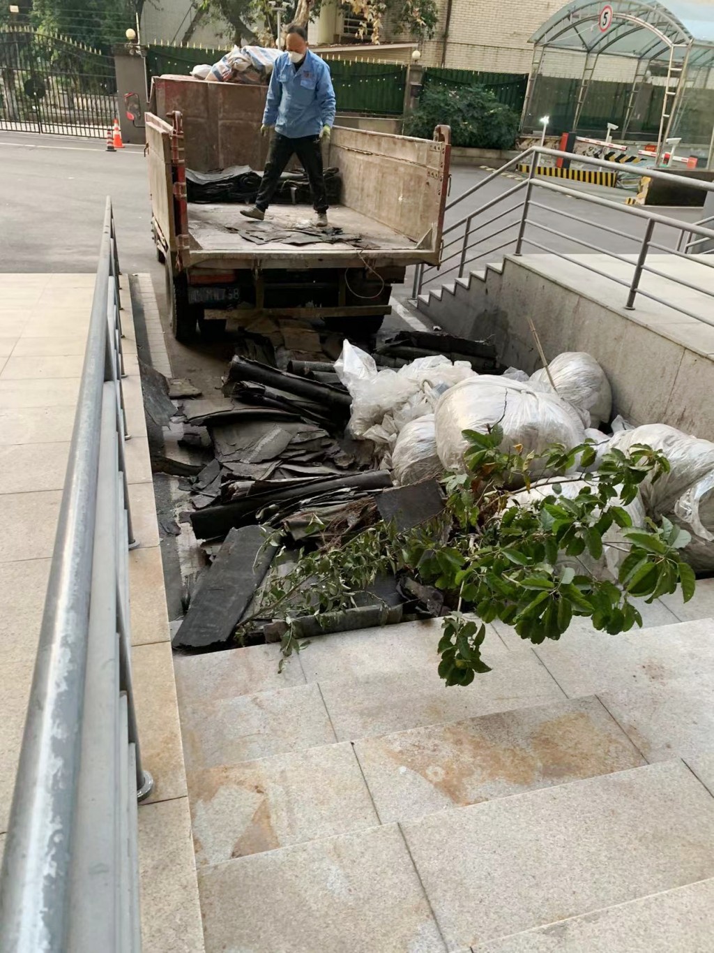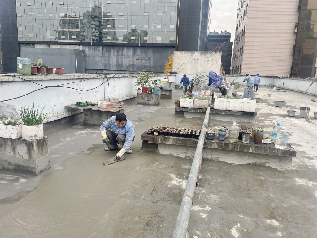 我公司采取的施工方案為:先將地面原有改性瀝青防水卷材清理掉,然后在地面及墻面滿鋪一層濕鋪防水卷材(濕鋪防水卷材可避免水在防水卷材底下到處竄的情況),防水卷材施工后在表面做一層砂漿保護層蓋住防水卷材,讓防水卷材免受紫外線照射,延長防水卷材壽命,最后將施工產生的建渣搬運下樓并清運出場。