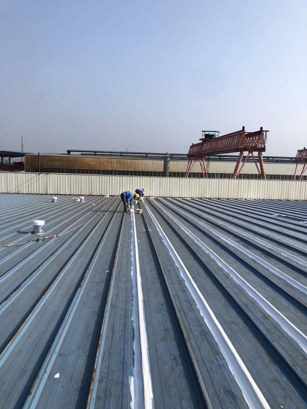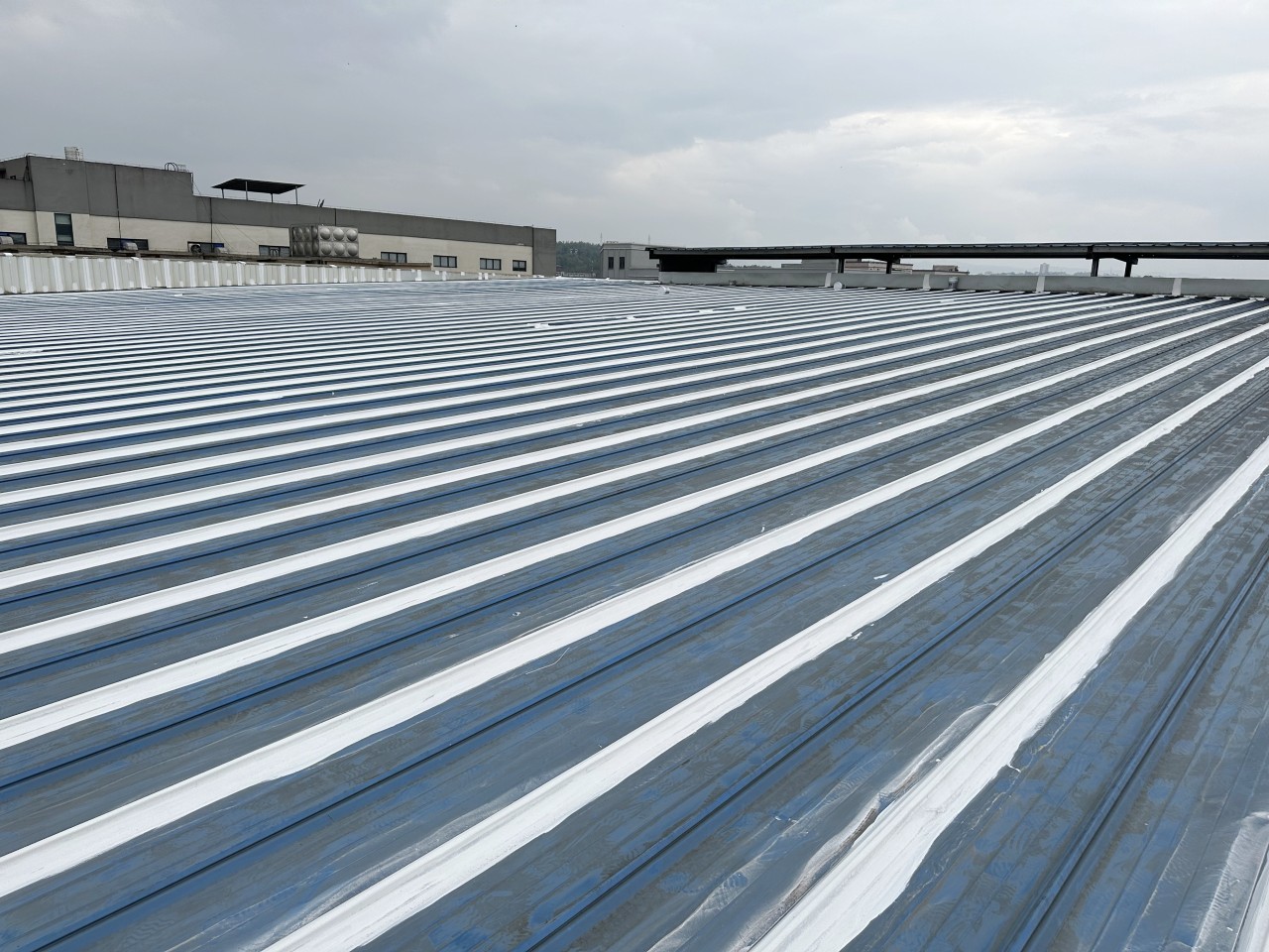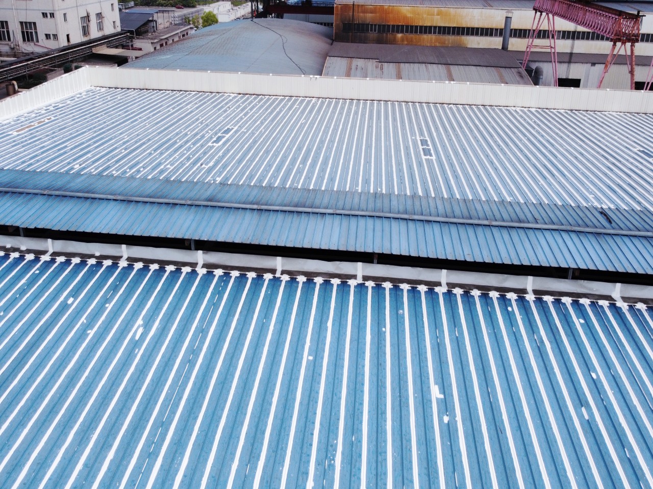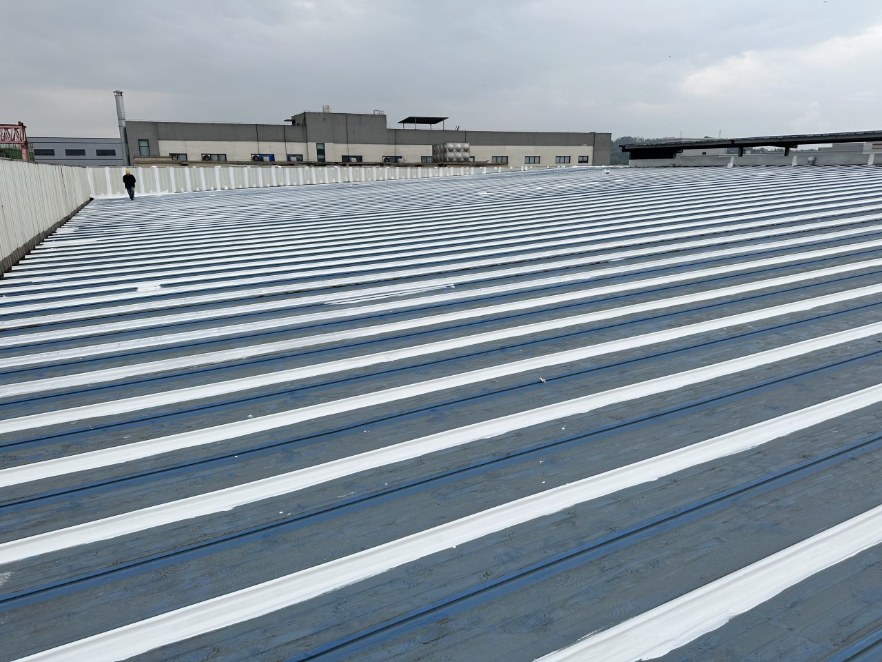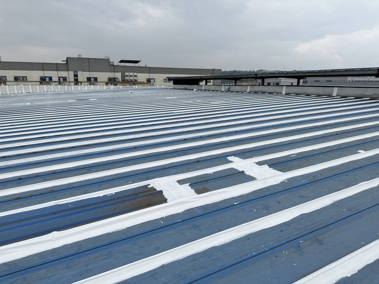 此位于重慶市榮昌區榮升路103號的鋼結構廠房是已經修建好了近十年了,最近一兩年逐漸出現了彩鋼頂漏雨的情況,開始的時候漏水點還不是很多,逐漸的漏水點越來越多,影響到了廠房內部的生產活動,業主方開始也找其他公司進行過一些修補施工,但是效果不是很理想,之前的施工方采用的是丁基膠帶進行粘貼密封修補的,但是沒有過多久,那丁基膠帶就開裂了,又漏雨了,客戶找到我們公司,我們公司根據現場查勘之后,定制了適合現場實際的施工方案,采用SYR金屬屋面防水涂料配合縫織聚酯布針對彩鋼頂的彩鋼搭接縫、中間固定螺釘、彩鋼板的一些破損孔洞部位進行一布三涂的方式進行防水補漏施工,客戶看了施工方案之后比較滿意,然后又考察了采用SYR金屬屋面防水涂料施工的其他地方的工地之后,最終確定由我公司對此彩鋼頂進行全面的防水補漏處理。