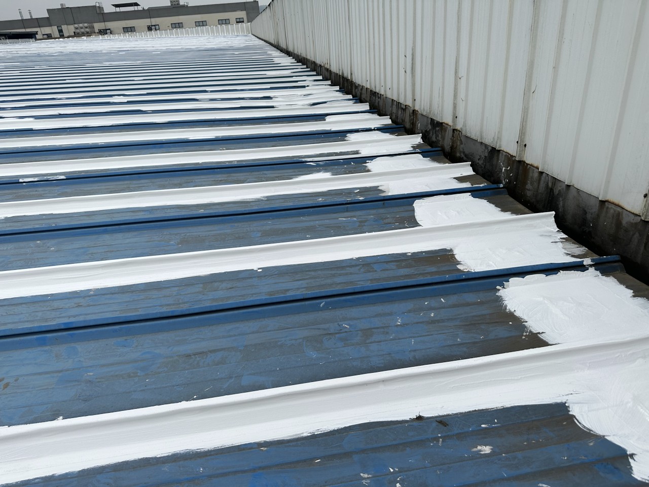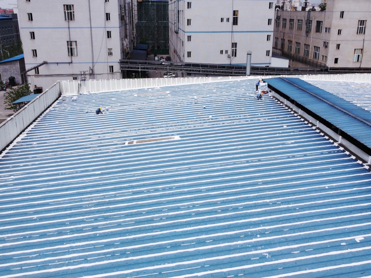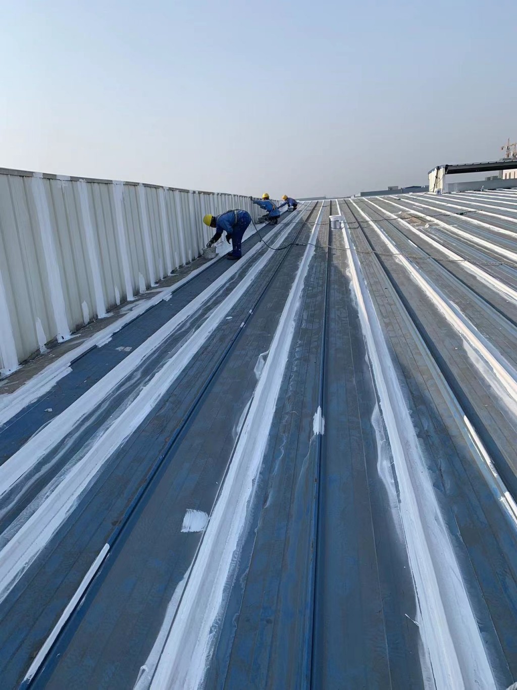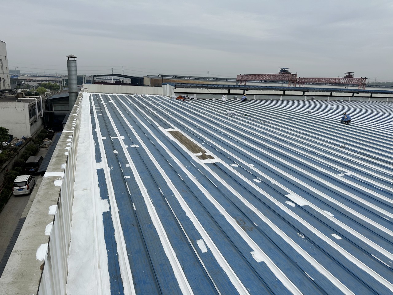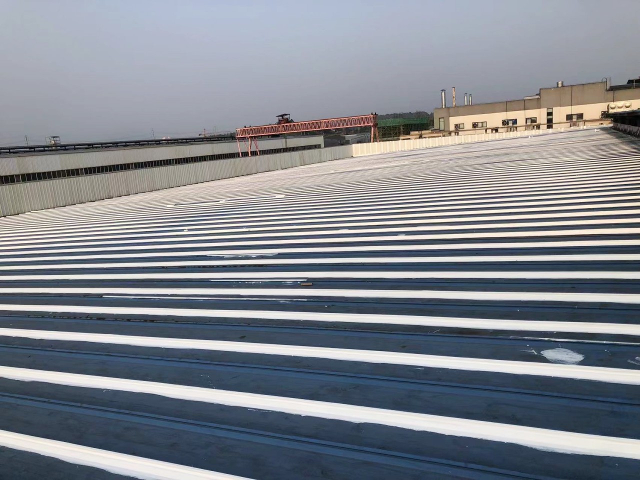 此位于重慶市榮昌區榮升路103號的鋼結構廠房是已經修建好了近十年了,最近一兩年逐漸出現了彩鋼頂漏雨的情況,開始的時候漏水點還不是很多,逐漸的漏水點越來越多,影響到了廠房內部的生產活動,業主方開始也找其他公司進行過一些修補施工,但是效果不是很理想,之前的施工方采用的是丁基膠帶進行粘貼密封修補的,但是沒有過多久,那丁基膠帶就開裂了,又漏雨了,客戶找到我們公司,我們公司根據現場查勘之后,定制了適合現場實際的施工方案,采用SYR金屬屋面防水涂料配合縫織聚酯布針對彩鋼頂的彩鋼搭接縫、中間固定螺釘、彩鋼板的一些破損孔洞部位進行一布三涂的方式進行防水補漏施工,客戶看了施工方案之后比較滿意,然后又考察了采用SYR金屬屋面防水涂料施工的其他地方的工地之后,最終確定由我公司對此彩鋼頂進行全面的防水補漏處理。