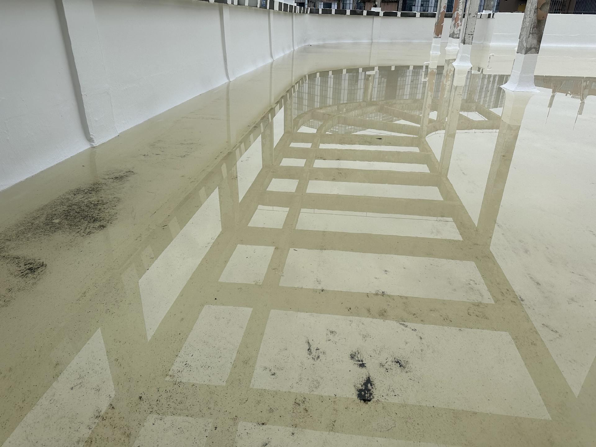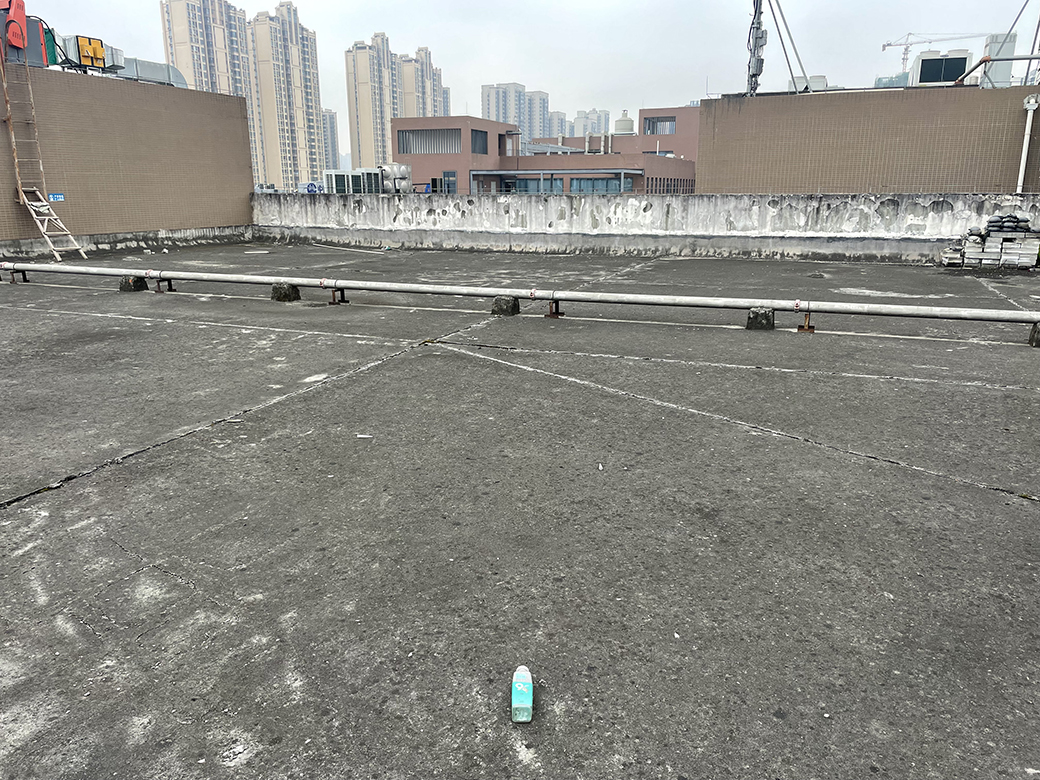 我公司現場施工工藝流程為:先將屋頂基層起殼易脫落的清理掉,破損部位水泥砂漿局部修補,然后基層表面滿涂刷混凝土液體硬化劑進行基層固化處理,這樣處理的好處是,后面做的防水層能夠與基層牢牢的粘結在一起;待混凝土液體硬化劑固化之后,屋頂的地面及墻面全部滿涂刷蜀禹Ⅰ型聚合物水泥防水涂料然后滿鋪貼專用的縫織聚酯布再涂刷蜀禹Ⅰ型聚合物水泥防水涂料,待干后表面涂刷蜀禹Ⅰ型聚合物水泥防水涂料,等待干后表面再涂刷兩道SYR金屬屋面防水涂料涂層。施工完畢之后,等待施工的防水涂層干透之后,屋頂做閉水試驗一星期后不漏水驗收合格之后交驗。
