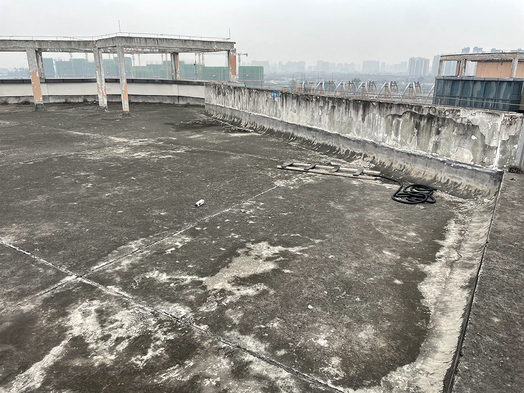 屋頂未施工之前,屋頂表面的保護層已經翻砂起殼,個別地方鋼筋都已經露出
