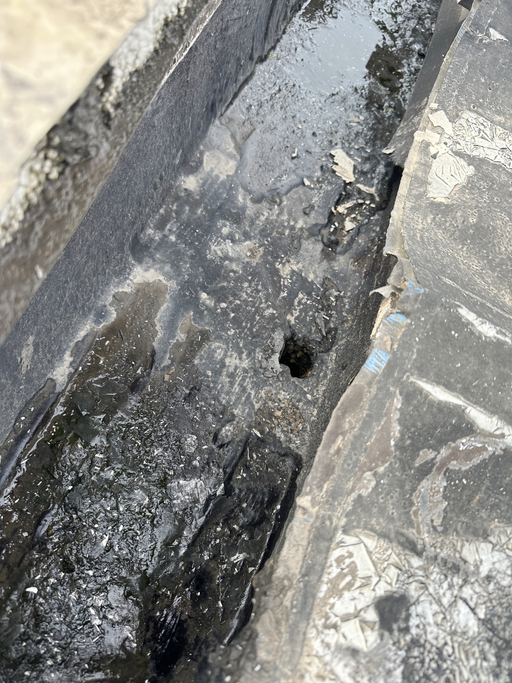 在施工過程中,公司技術團隊首先揭掉了天溝內的瀝青防水卷材,發現下方天溝已經銹蝕嚴重,出現了多處穿孔。針對這一問題,團隊先對天溝進行了除銹處理,并涂刷了免除銹納米固銹劑,有效阻止了銹蝕的進一步發展。隨后,團隊在天溝內涂刷了SYR金屬屋面專用防水涂料,并鋪貼了專用縫織聚酯布,以增強防水層的韌性和耐久性。最后,再在天溝表面涂刷了兩遍SYR金屬屋面專用防水涂料,確保防水效果達到**。
