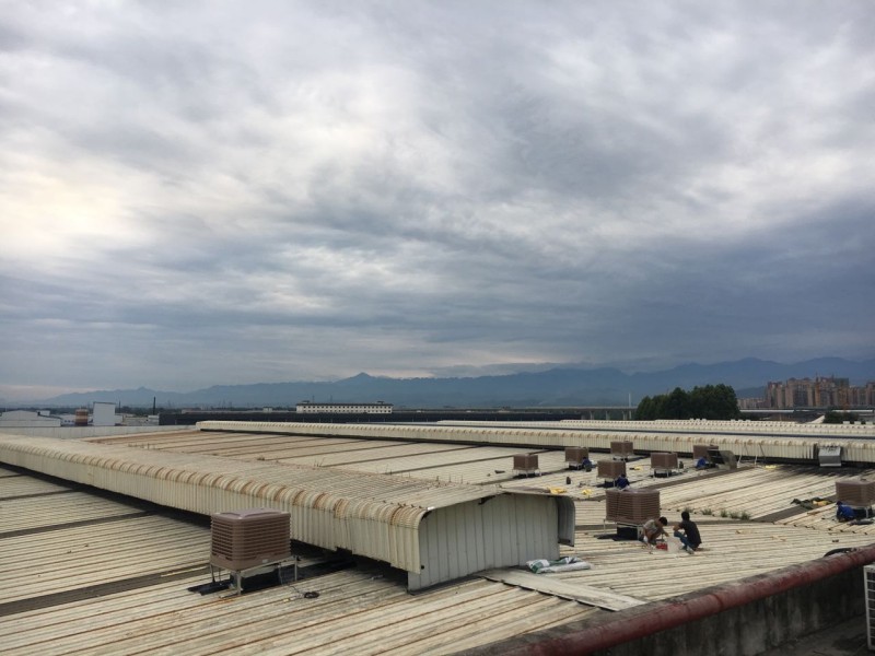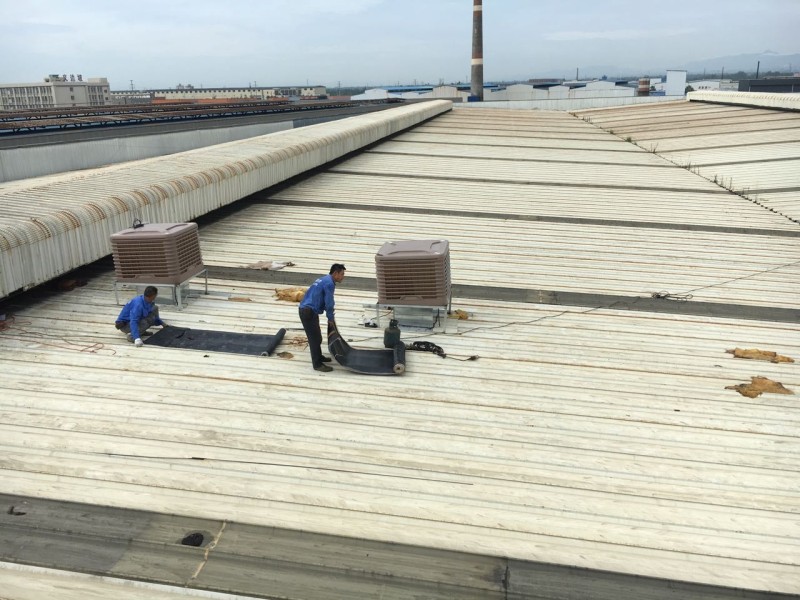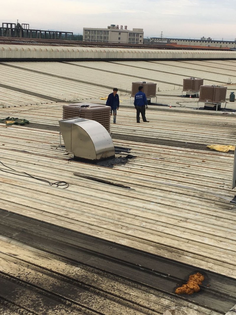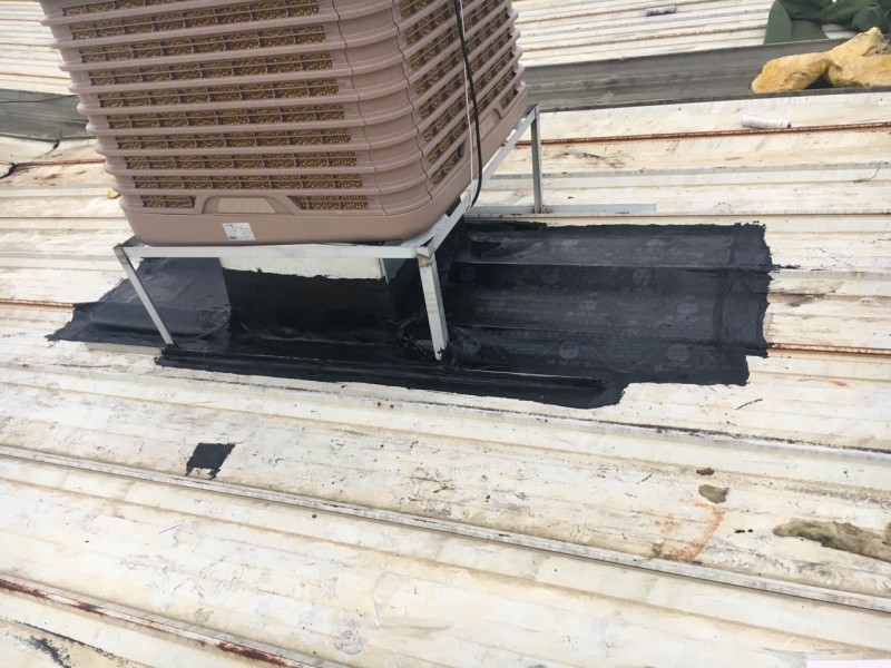 成都市大邑縣工業(yè)區(qū)龍廚食品廠房?jī)?nèi)由于夏季溫度太高,廠房?jī)?nèi)安裝冷風(fēng)機(jī),但是由于是在以前已經(jīng)修建好的彩鋼頂上開(kāi)孔安裝冷風(fēng)機(jī),冷風(fēng)機(jī)安裝好之后,冷風(fēng)機(jī)排風(fēng)管穿過(guò)彩鋼頂?shù)牡胤介_(kāi)的孔周邊漏水,我公司采用瀝青防水卷材施工,對(duì)排風(fēng)孔周邊進(jìn)行了防水補(bǔ)漏處理。